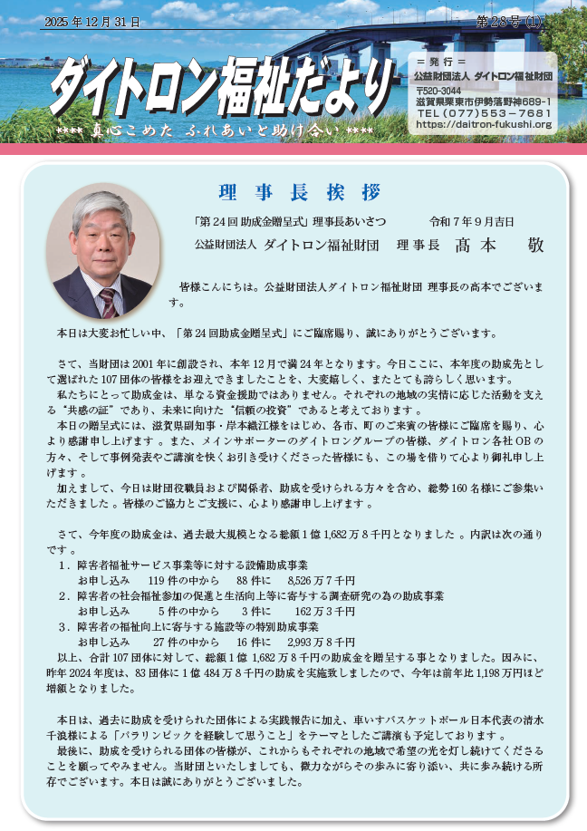 9月9日大津市のピアザ淡海にて「第24回障害者福祉助成金贈呈式」が開催されました。 助成先・来賓・財団役職員 合わせて約160名が出席し、障害者団体様に目録が贈呈されました。 また、パリ2024パラリンピック競技大会車い […] -